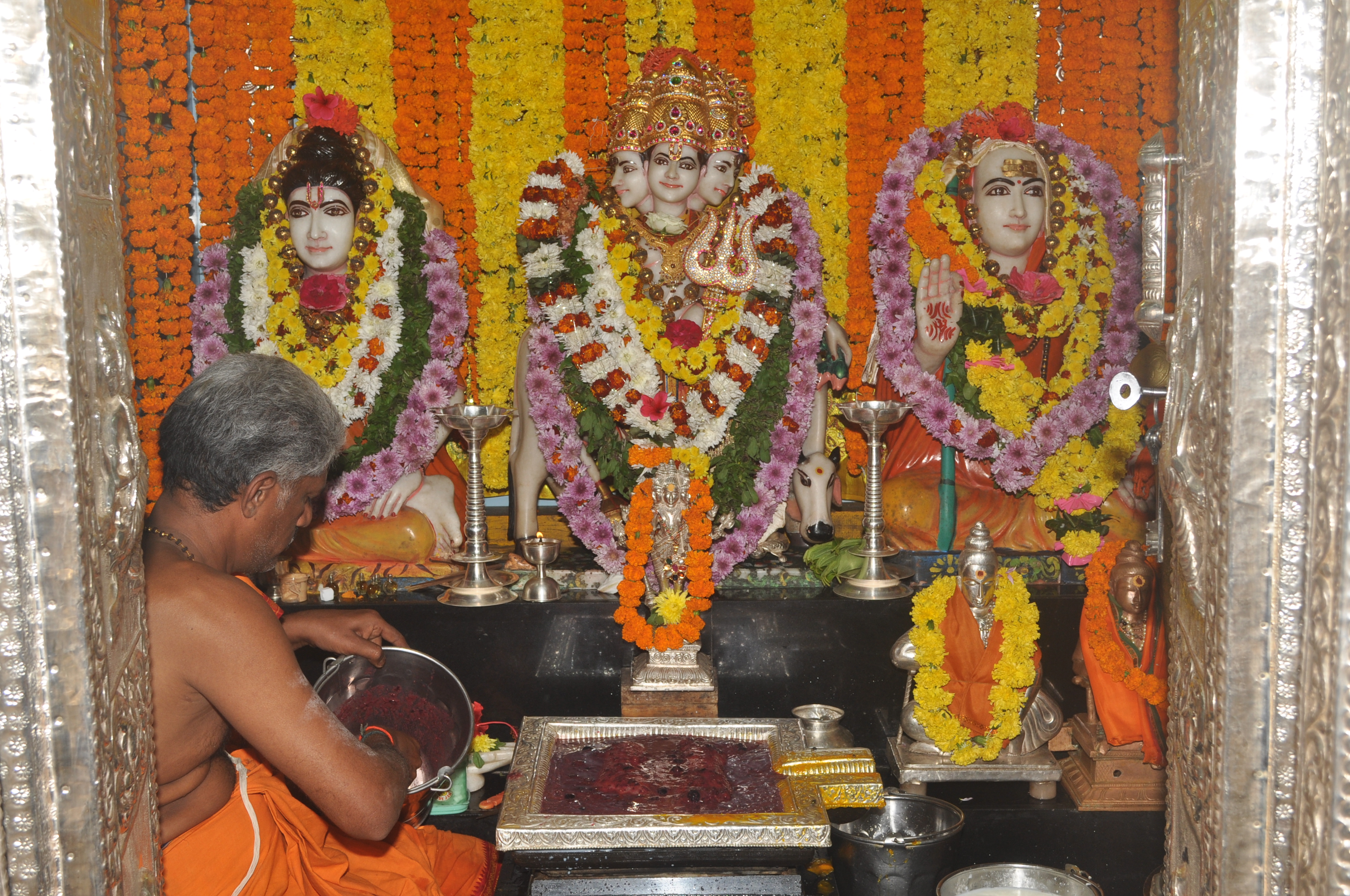 | Rudraabhisheka Sahita Maha Pooja The Lotus feet of the lord are being Worshipped with Eleven items (Cow Milk, Cow Curd, Cow Ghee, Honey, Sugar, Sandal Wood, Vibhuthi, Perfume, Rosewater, Fruit Juice and Vattiverllu) 11 times along with Rudranamaka chamakams, by the purohits. Of the 'Thrimurthis' Rudra is one , who is Fond of Abhishekam and Lord Sripada Srivallabha is the incarnation of Dattatreya who is the embodiment of the Thrimurthis, this Abhishekam is very much liked by him.So all the Devotees are requested to take port in doing this Abhishekam to the Lord and get his blessings in plenty